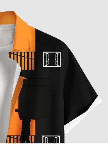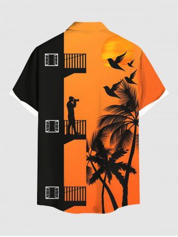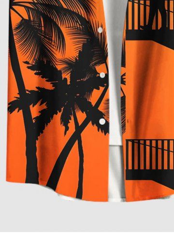 Plus Size Coconut Tree Building Bird Print Hawaii Button Pocket Shirt For Men - Orange - Orange