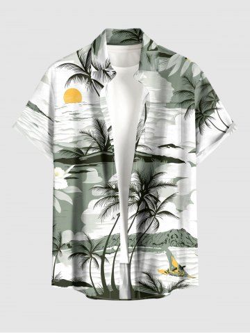 Plus Size Coconut Tree Flower Sun Print Buttons Pocket Hawaii Shirt For Men - Vert Clair - Vert Clair
