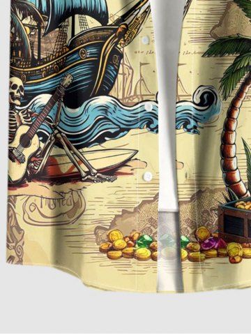 Plus Size Coconut Tree Sailboat Skull Pirate Print Hawaii Cruise Button Pocket Shirt For Men - Jaune Clair - 3xl