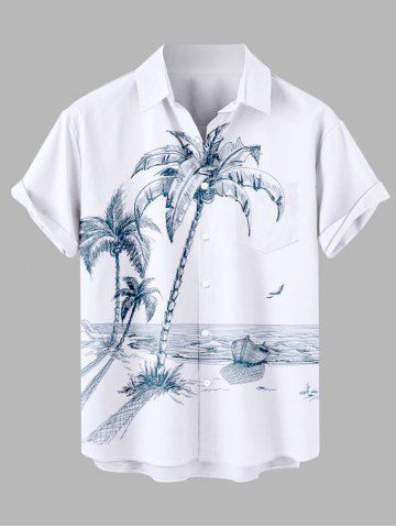 Plus Size Coconut Tree Sea Boat Bird Print Buttons Pocket Hawaii Shirt For Men - Blanc - Blanc