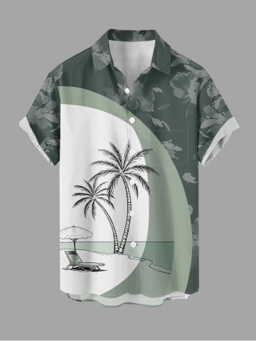 Plus Size Coconut Tree Seascape Umbrella Flowers Colorblock Print Buttons Pocket Hawaii Shirt For Men - Vert Clair - Vert Clair
