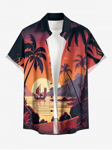 Chemise à Manches Courts> Plus Size Coconut Tree Sun Mountain Seascape Boat Print Buttons Pocket Hawaii Shirt For Men