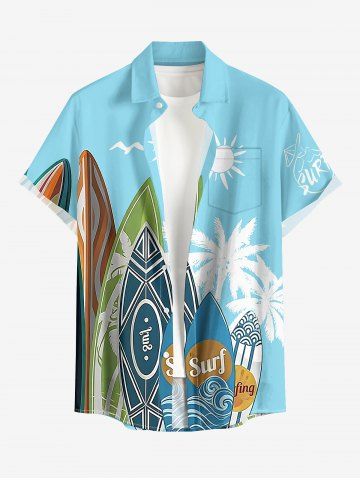 Plus Size Coconut Tree Sun Surfboard Sea Waves Print Hawaii Button Pocket Shirt For Men - Bleu Clair - Bleu Clair
