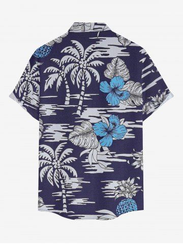 Plus Size Coconut Tree Tropical Leaf Hibiscus Flower Print Hawaii Button Pocket Shirt For Men - Bleu Profond - L