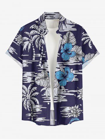 Plus Size Coconut Tree Tropical Leaf Hibiscus Flower Print Hawaii Button Pocket Shirt For Men - Bleu Profond - 5xl