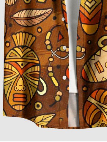 Plus Size Ethnic Graphic Mask Print Hawaii Button Pocket Shirt For Men - Brun - Brun