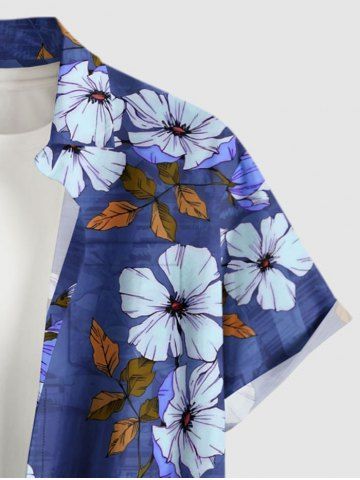 Plus Size Flower Leaf Branch Print Hawaii Button Pocket Shirt For Men - Bleu Profond - Xl