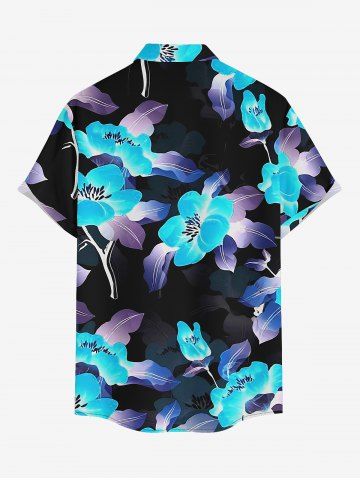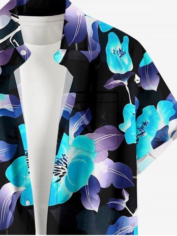Plus Size Flower Leaf Print Hawaii Button Pocket Shirt For Men - Bleu - Bleu