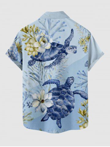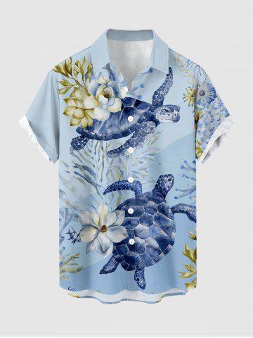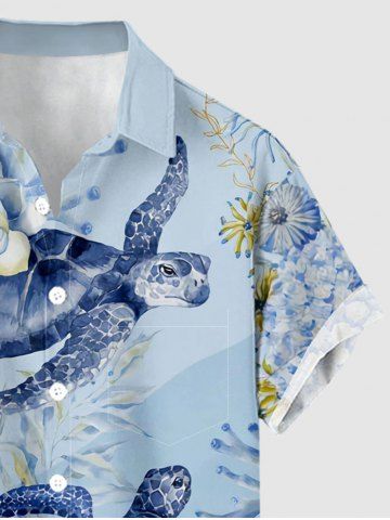 Plus Size Flower Turtle Coral Print Hawaii Sea Creatures Button Pocket Shirt For Men - Bleu Clair - Bleu Clair