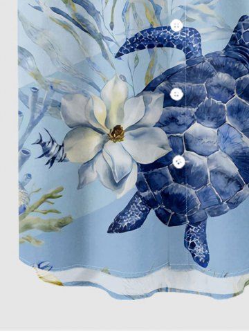 Plus Size Flower Turtle Coral Print Hawaii Sea Creatures Button Pocket Shirt For Men - Bleu Clair - Bleu Clair