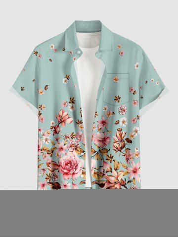 Plus Size Flowers Leaf Print Buttons Pocket Hawaii Shirt For Men - Turquoise - Turquoise