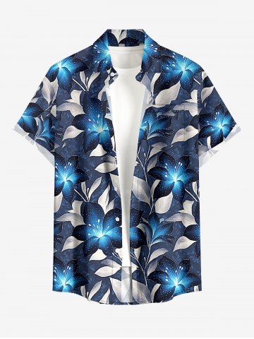 Plus Size Glitter Flower Leaf Print Hawaii Button Pocket Shirt For Men - Bleu Profond - 4xl