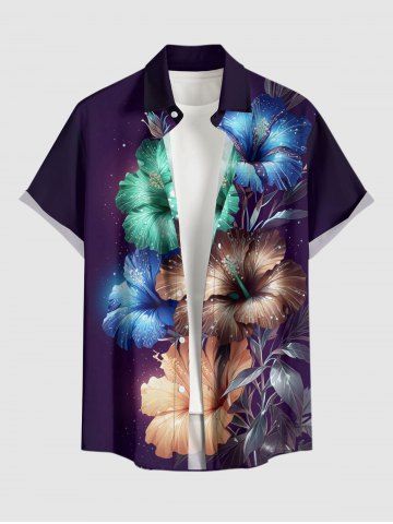 Plus Size Glitter Hibiscus Flower Print Hawaii Button Pocket Shirt For Men - Concorde - Xl