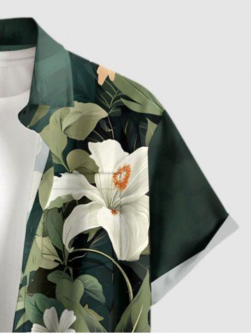 Plus Size Hibiscus Flower Leaf Branch Print Hawaii Button Pocket Shirt For Men - Vert Profond - 3xl
