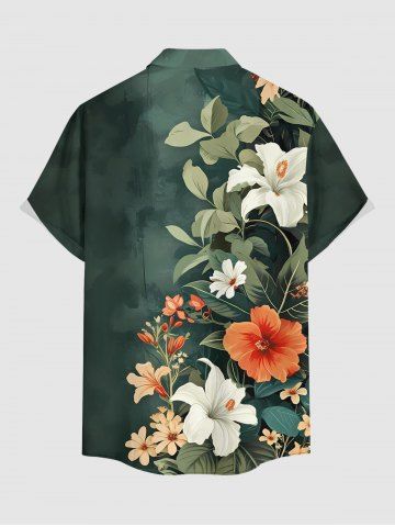 Plus Size Hibiscus Flower Leaf Branch Print Hawaii Button Pocket Shirt For Men - Vert Profond - 4xl