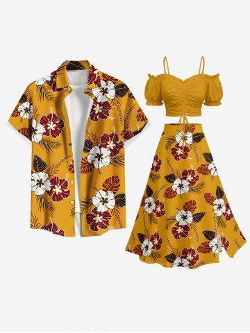 Plus Size Hibiscus Flower Leaf Print Buttons Pocket Hawaii Shirt For Men - Orange - Orange