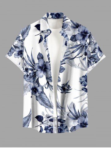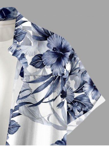 Plus Size Hibiscus Flower Leaf Print Buttons Pocket Hawaii Shirt For Men - Cadetblue - M