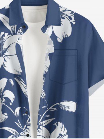 Plus Size Hibiscus Flower Leaf Print Buttons Pocket Hawaii Shirt For Men - Bleu - Bleu