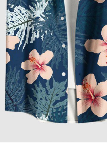 Plus Size Hibiscus Flower Tropical Leaf Print Buttons Pocket Hawaii Shirt For Men - Paon Bleu - 2xl