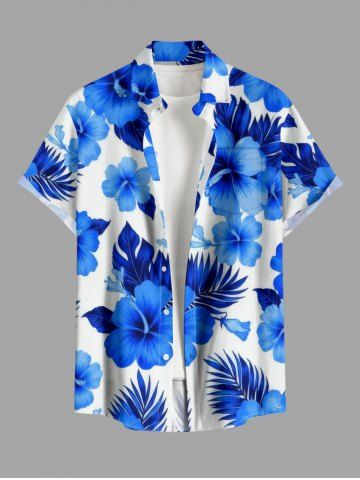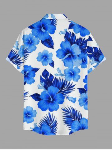 Plus Size Hibiscus Flower Tropical Leaf Print Buttons Pocket Hawaii Shirt For Men - Bleu Ciel - Bleu Ciel