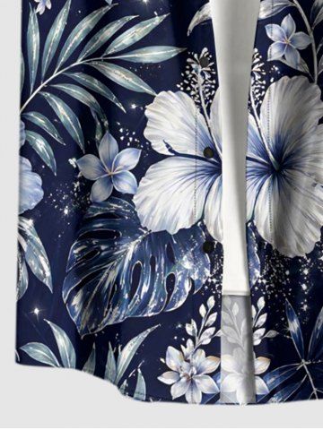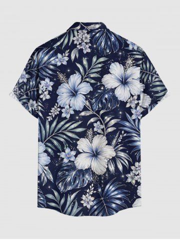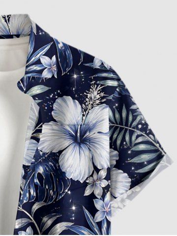 Plus Size Hibiscus Flower Tropical Leaf Print Buttons Pocket Hawaii Shirt For Men - Bleu De Minuit - 2xl
