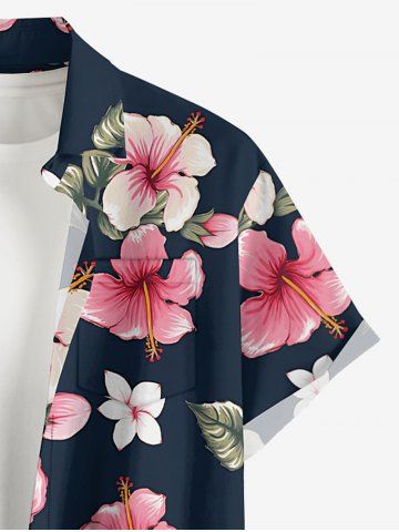 Plus Size Hibiscus Flowers Leaf Print Buttons Pocket Hawaii Shirt For Men - Bleu Profond - M