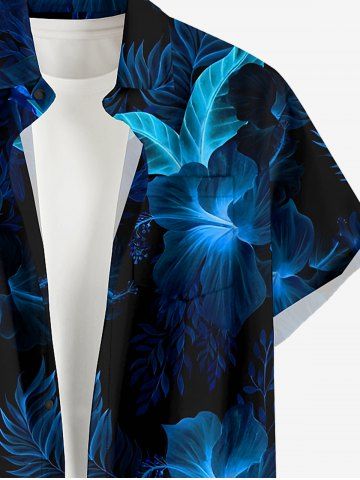 Plus Size Hibiscus Flowers Leaf Print Buttons Pocket Hawaii Shirt For Men - Bleu De Minuit - S