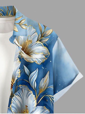 Plus Size Hibiscus Flowers Ombre Metallic Print Buttons Pocket Hawaii Shirt For Men - Bleu - Bleu