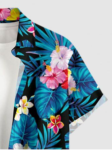 Plus Size Hibiscus Flowers Tropical Leaf Print Buttons Pocket Hawaii Shirt For Men - Bleu - Bleu