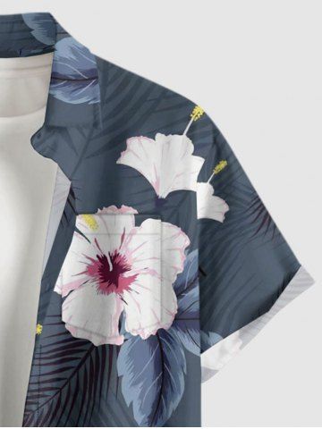 Plus Size Hibiscus Flowers Tropical Leaf Print Buttons Pocket Hawaii Shirt For Men - Bleu-gris - Xl