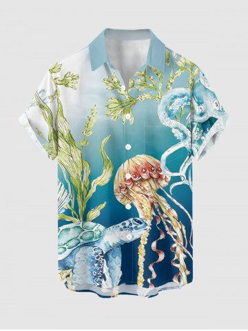 Plus Size Jellyfish Octopus Turtle Ombre Print Buttons Pocket Hawaii Shirt For Men - Bleu Ciel - Bleu Ciel