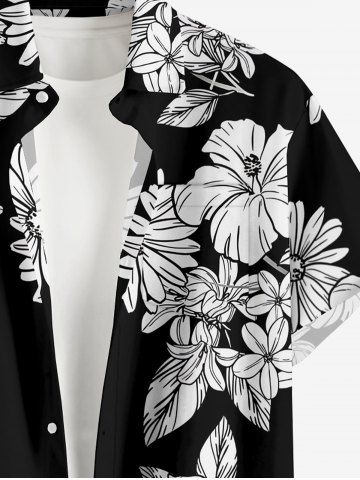 Plus Size Leaf Hibiscus Flower Print Hawaii Button Pocket Shirt For Men - Noir - Noir