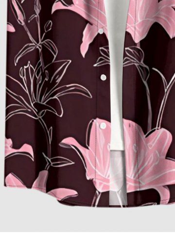 Plus Size Lily Flower Print Hawaii Button Pocket Shirt For Men - Rouge Foncé - 2xl