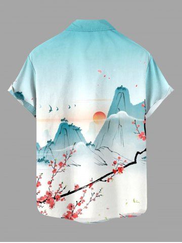 Plus Size Mountain Flower Branch Sun Print Buttons Pocket Hawaii Shirt For Men - Bleu Clair - Bleu Clair