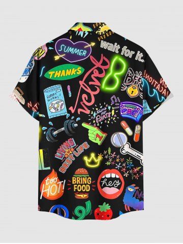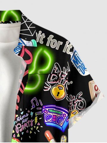 Plus Size Neon Funny Letters Music Print Hawaii Button Pocket Shirt For Men - Noir - Noir