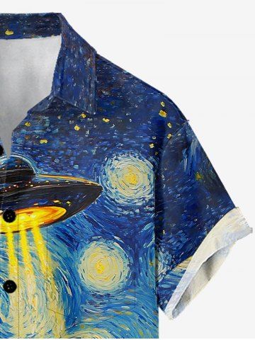 Plus Size Oil Painting Moon UFO Cows Mountain Print Buttons Pocket Hawaii Shirt For Men - Bleu - Bleu