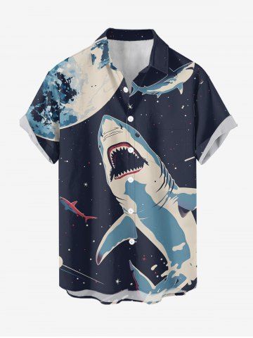 Plus Size Shark Planet Plane Galaxy Print Hawaii Button Pocket Shirt For Men - Bleu De Minuit - S