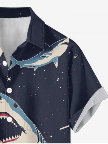 Plus Size Shark Planet Plane Galaxy Print Hawaii Button Pocket Shirt For Men - Bleu De Minuit - 2xl
