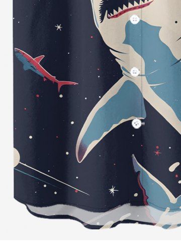 Plus Size Shark Planet Plane Galaxy Print Hawaii Button Pocket Shirt For Men - Bleu De Minuit - 4xl