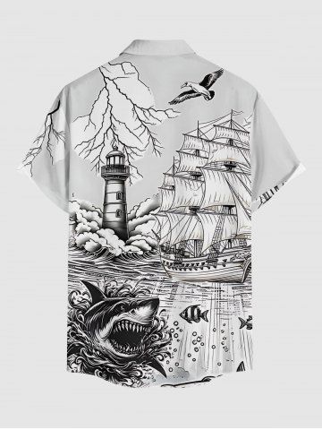 Plus Size Shark Sailboat Sea Waves Lighthouse Print Hawaii Cruise Button Pocket Shirt For Men - Blanc - Blanc