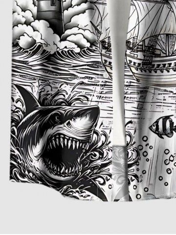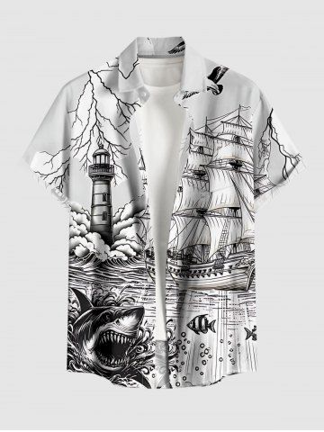 Plus Size Shark Sailboat Sea Waves Lighthouse Print Hawaii Cruise Button Pocket Shirt For Men - Blanc - Blanc