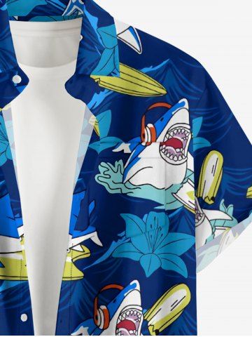 Plus Size Shark Sea Waves Hibiscus Flower Print Hawaii Button Pocket Shirt For Men - Bleu Profond - 6xl