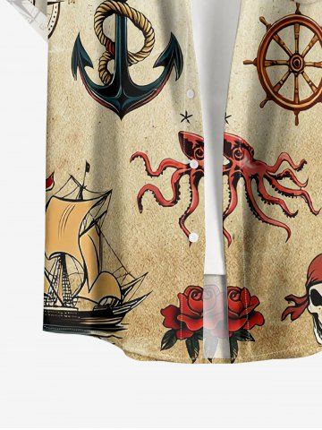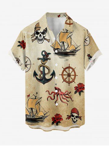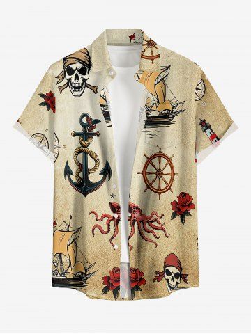 Plus Size Skull Pirate Flower Ship Rudder Anchor Octopus Print Buttons Pocket Hawaii Shirt For Men - Café Lumière - Xl