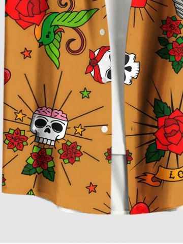Plus Size Skull Rose Flower Heart Wing Print Hawaii Button Pocket Shirt For Men - Café - Café