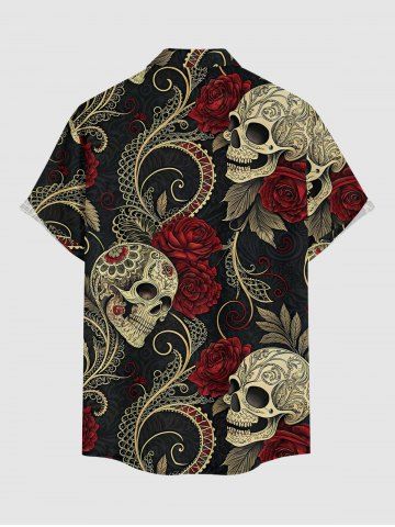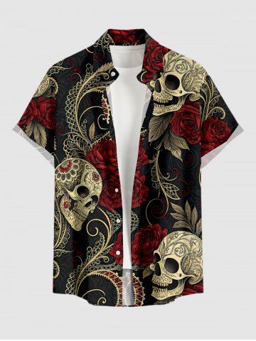 Plus Size Skull Rose Flower Leaf Print Button Pocket Shirt For Men - Rouge Foncé - M