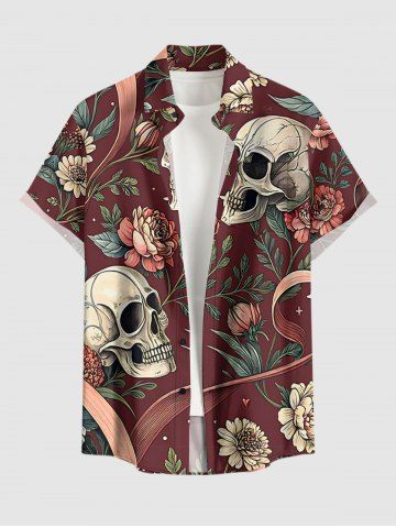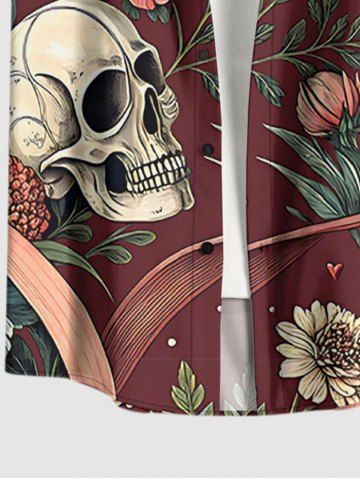 Plus Size Skulls Flowers Print Buttons Pocket Hawaii Shirt For Men - Rouge Vineux - 4xl
