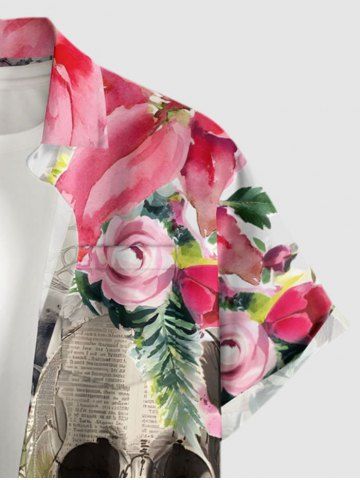 Plus Size Skulls Newspaper Flower Print Hawaii Button Pocket Shirt For Men - Rose - Rose