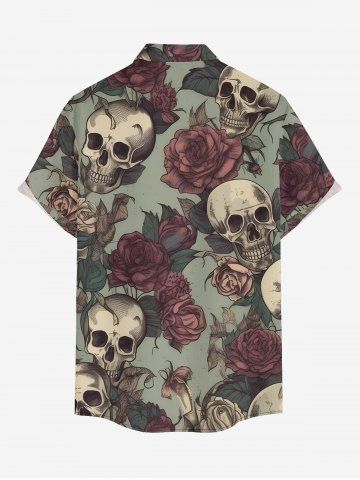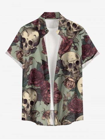 Plus Size Skulls Rose Flower Leaf Print Buttons Pocket Hawaii Shirt For Men - Vert Clair - Vert Clair