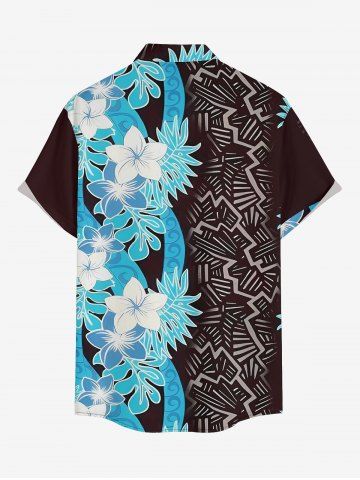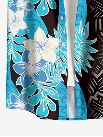 Plus Size Tropical Leaf Flower Ethnic Print Hawaii Button Pocket Shirt For Men - Bleu Clair - Bleu Clair
