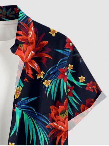 Plus Size Tropical Leaf Flower Print Hawaii Button Pocket Shirt For Men - Noir - Noir